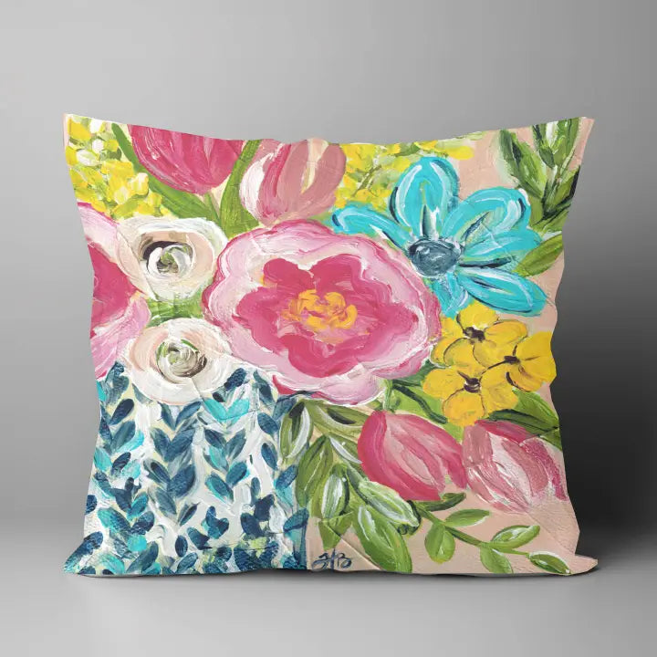 A SPRING MIX IN A PRETTY BLUE PATTERN VASE IS ALWAYS A WINNER, NO MATTER WHERE IT SITS.