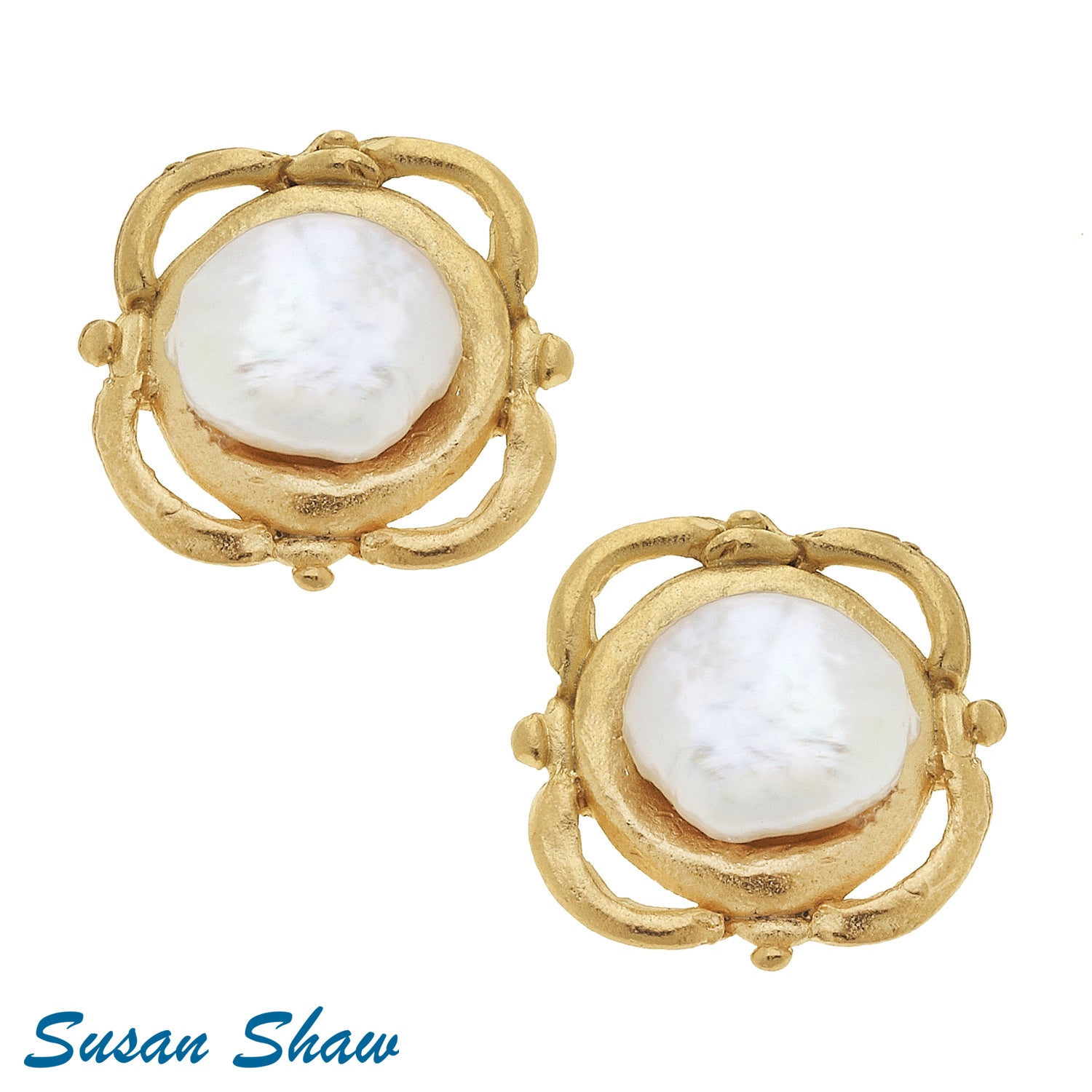 Susan Shaw Handcast Gold Scroll and Pearl Clip Earrings 1452WC