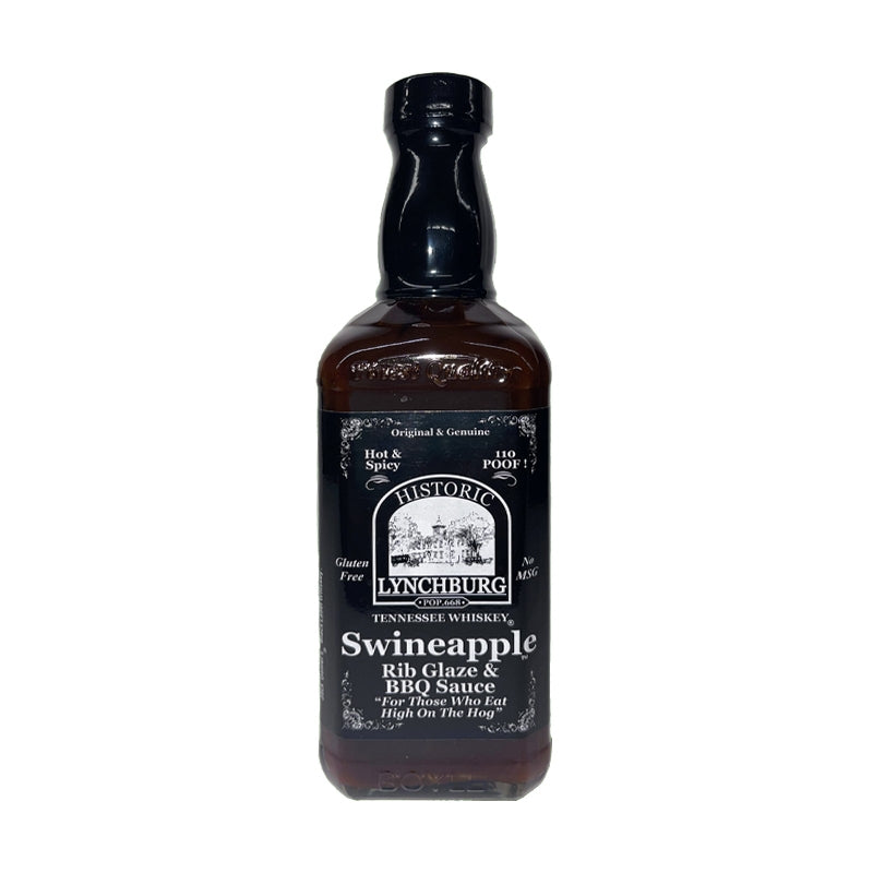 Swineapple Rib Glaze & Dipping Sauce is “For Those Who Eat High On The Hog!” A distinctive sweet and tasty blend of tomato concentrate, vinegar, corn syrup, molasses, brown sugar, honey, spices, onion, garlic, pineapple, worcestershire sauce, soy sauce, apple juice, natural hickory smoke and Jack Daniel’s Black Label Whiskey.