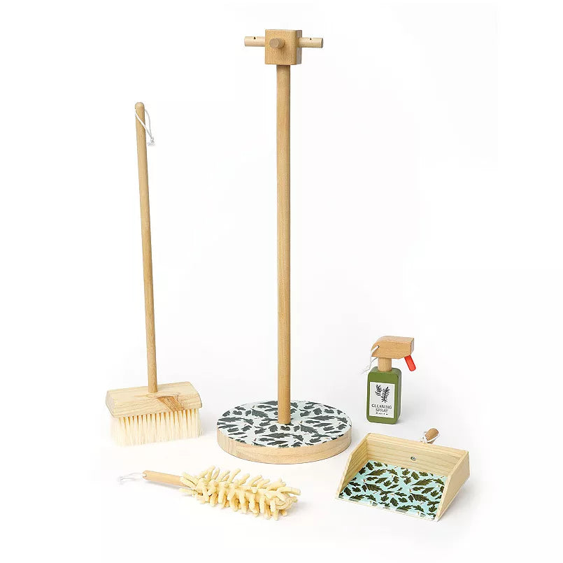 Manhattan Toy Wooden Spruce Housekeeping Cleaning Set includes a stand, broom, dustpan, and other accessories.