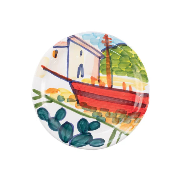 The small fishing village comes to life in vibrant colors and abstract brushstrokes on the Portofino Salad Plate, inspired by the charming habor along the Italian Riviera.