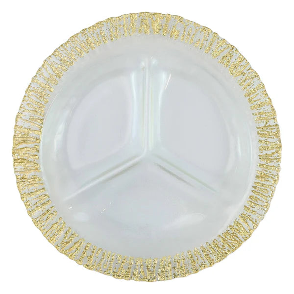 The Rufolo Glass Gold Three-Part Server features golden strands on the border of the elegantly sophisticated platter. The embellishment is effortlessly beautiful.