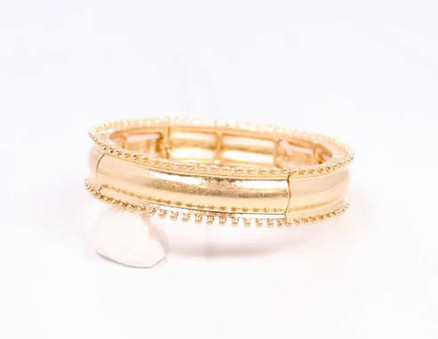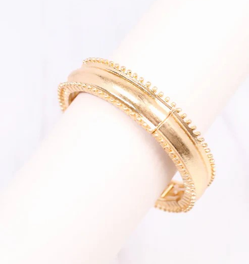 This amazing metal stretch bracelet has a vintage look and a slightly worn finish. It has a dotted edge design for added dimension, and it pairs so easily with any outfit. Wear with multiple bracelets for a gorgeous stacked look. Stretches to fit most wrists.