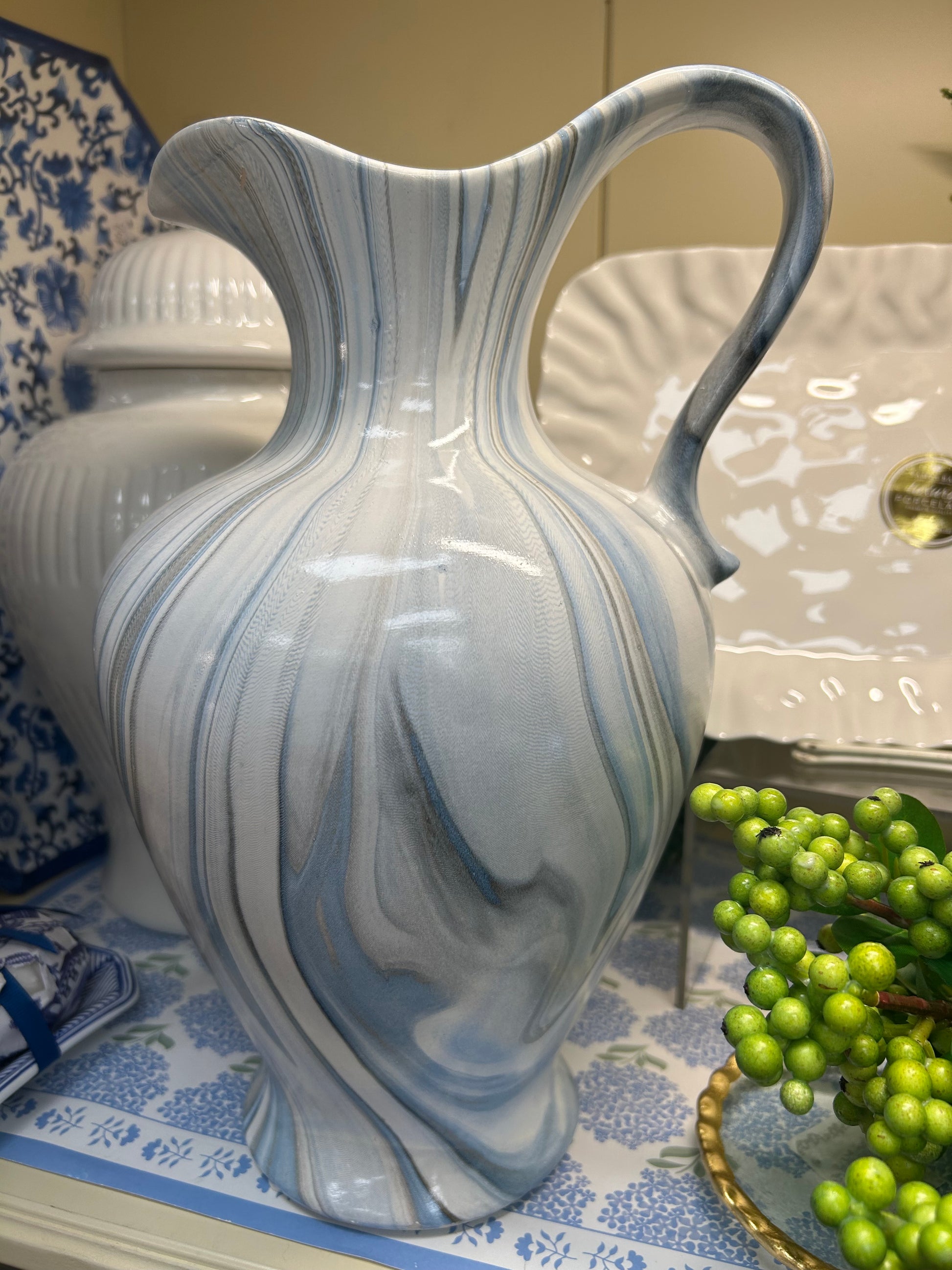 12" White marbleized pitcher. A beautiful blend of gold, blue and cream swirls mixed into each other to create a pattern of color pleasing in any decor.