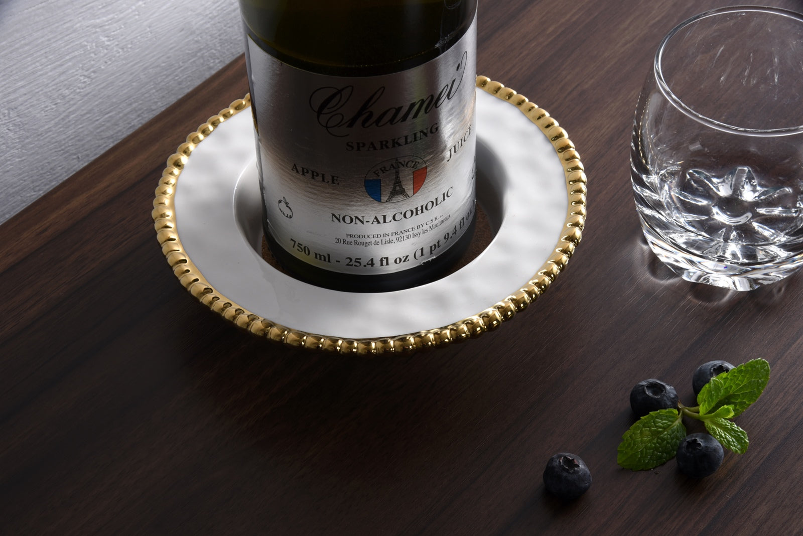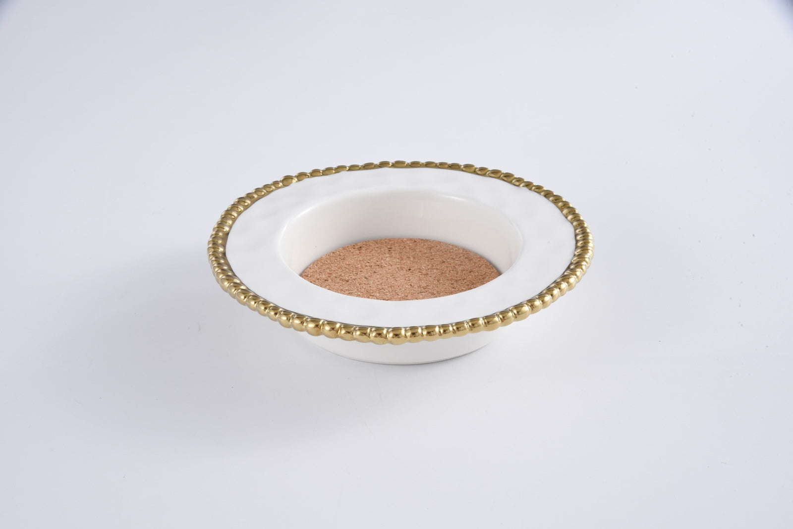 Wine Bottle Coaster with cork insert in Golden Salerno. Great to give as a gift alone or with a bottle of wine! Every home needs at least one of these gorgeous and practical coasters. Perfect for wine bottles and water bottles, this coaster will prevent drips or condensation from running onto your table! Gleaming white porcelain with lustrous gold beads in titanium. Removable 3mm thick cork insert. Food safe, dishwasher safe, oven safe to 500°. Easy Care.
